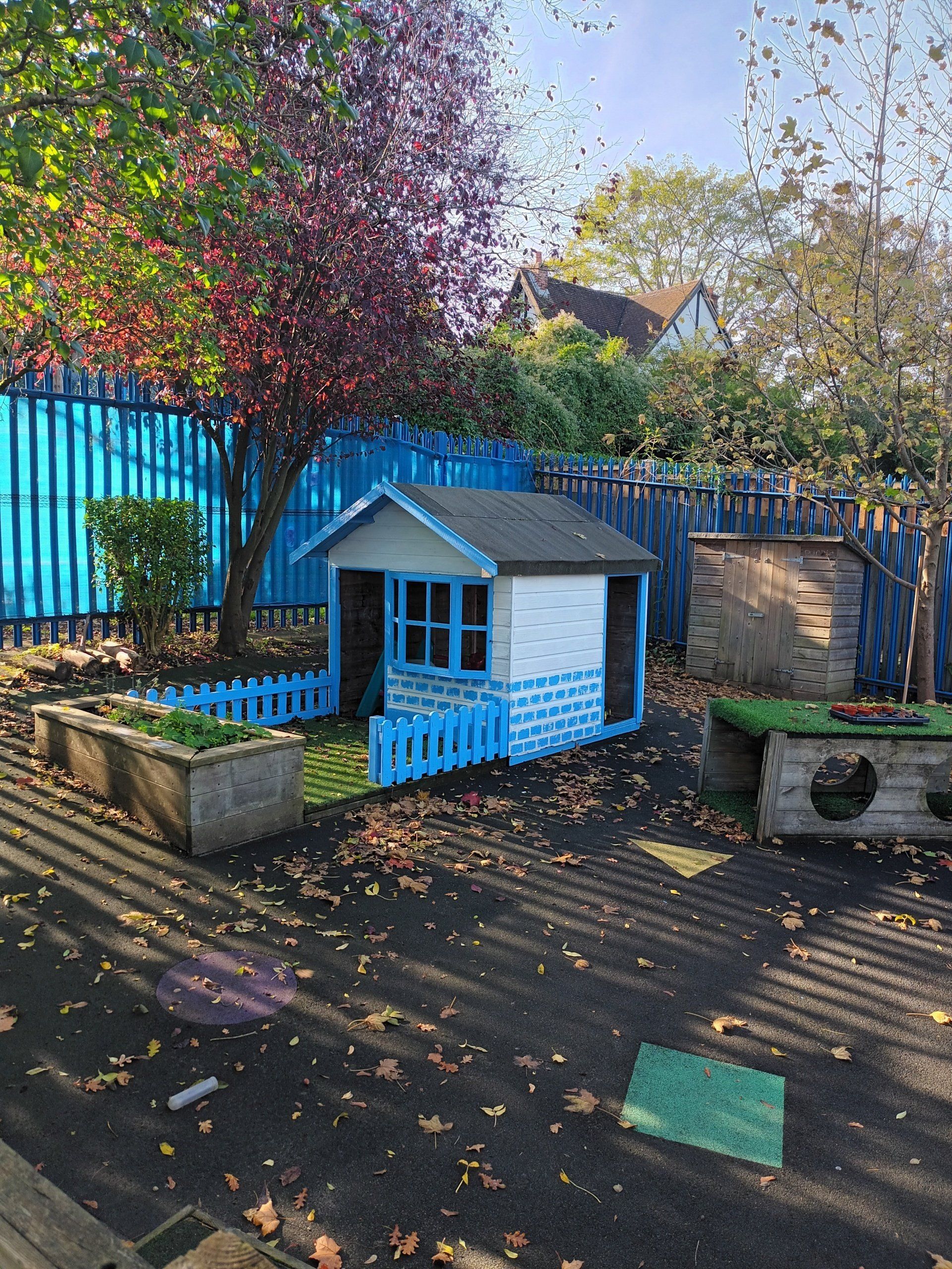 The outdoor garden has a covered area, playhouse, climbing frame, vegetable garden, and child friendly plants providing an exciting and stimulating area.