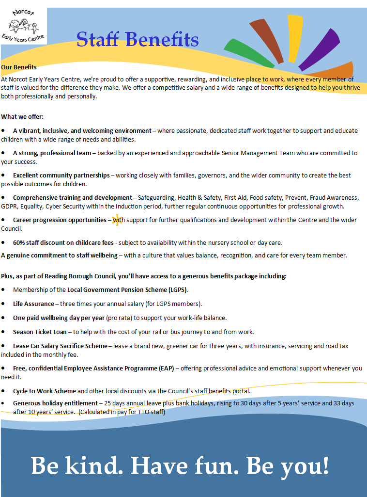 At Norcot Early Years Centre, we’re proud to offer a supportive, rewarding, and inclusive place to work, where every member of staff is valued for the difference they make. We offer a competitive salary and a wide range of benefits designed to help you thrive both professionally and personally.