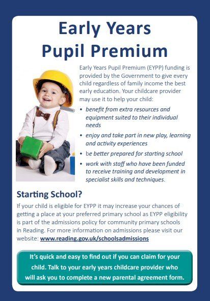 Your child may be entitled to a sum of money paid to their school or childcare setting. The Early Years Pupil Premium gives providers of early education and childcare extra funding to support and boost the learning of certain three and four year olds.