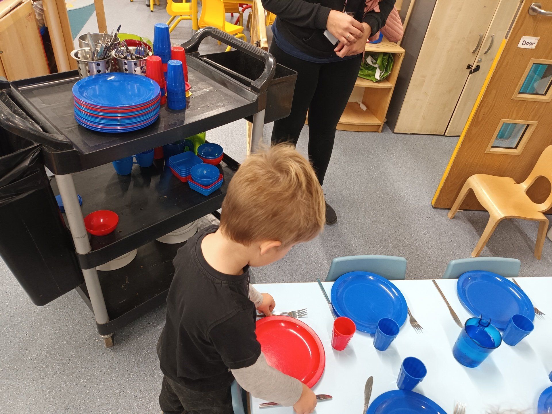 Planned and organised Learning Opportunities as well as free play inside and outside. Children help set up dinner places at the tables.